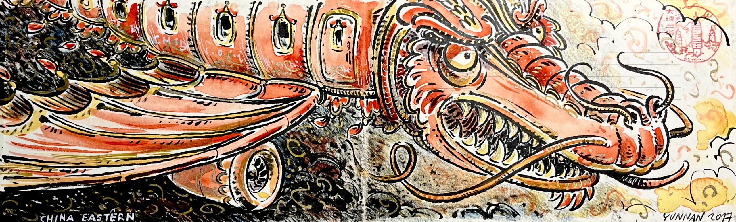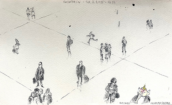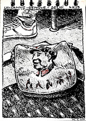 Il m’arrive de simplement de caricaturer mes contemporains voyageurs, mais le plus souvent j’improvise plutôt une illustration qui servira de page de garde à mon carnet.
