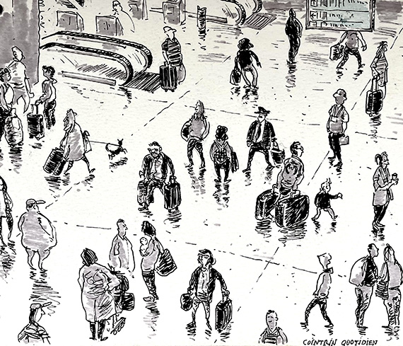 Ces dessins sont souvent des clins d’œil, des évocations fantasmées, stéréotypées, de ce que m’inspire notre destination du jour.